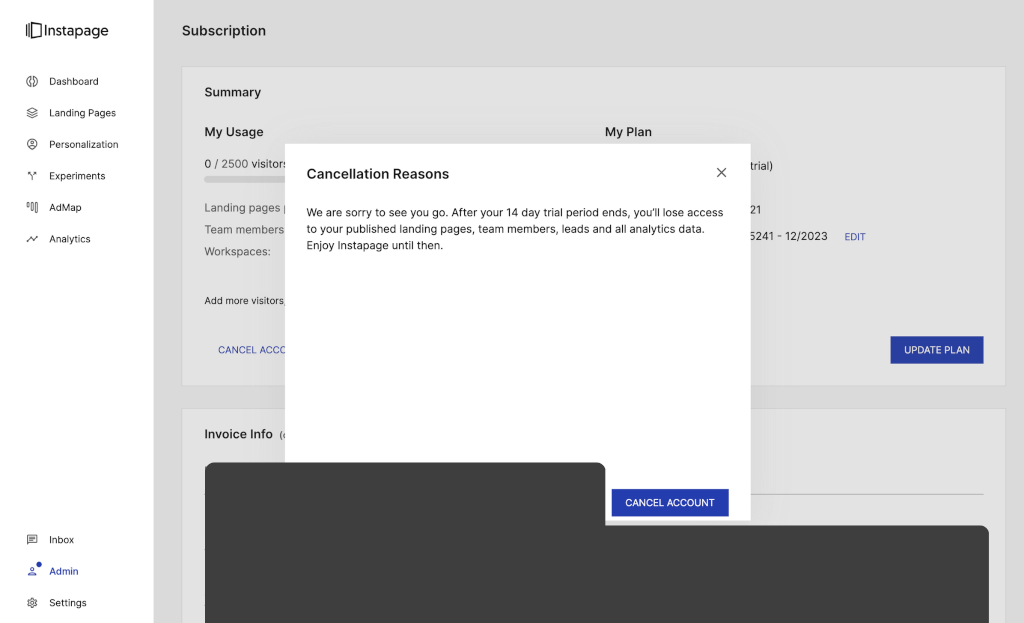 次に「CANCEL ACCOUNT」をクリックすると、アカウント(プラン)の解約手続きを行うことができます。