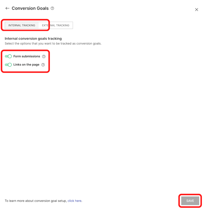 LP作成ページにおける「Conversion goals」を使用すれば、各ランディングページに対してコンバージョンゴールを設定することが可能です。