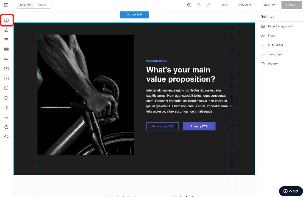 下記のように、さまざまなボタンがあり、直感的な操作でランディングページを編集できます。