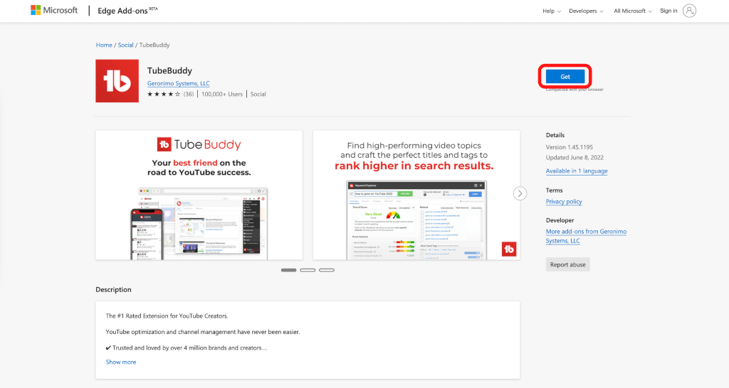 Pertama, akses halaman beranda dari situs web TubeBuddy resmi dengan browser “Microsoft Edge”.