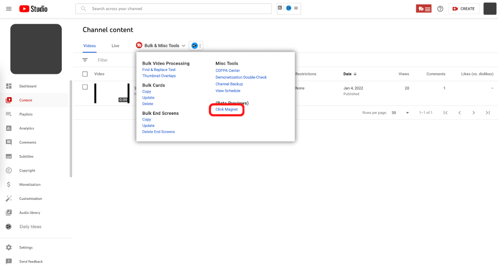 2. selecione “Content” (Conteúdo) na barra lateral esquerda e clique em “Click Magnet” (Ímã de cliques) em “Bulk & Music Tools” (Ferramentas de volume e música).