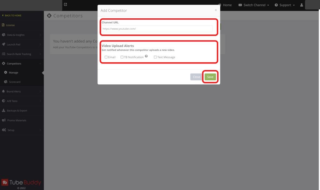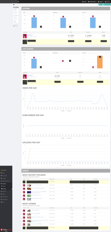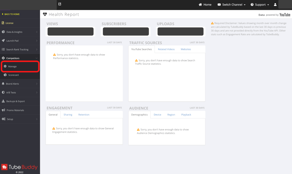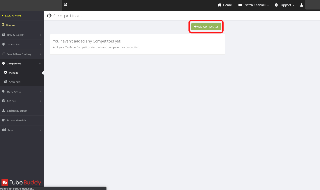 Até 10 canais. 1. vá para a tela do painel de instrumentos TubeBuddy e selecione ‘Concorrentes’ na barra lateral esquerda ![]() 2. Ir para ‘Gerenciar’ > ‘Adicionar Concorrente’ para adicionar um canal concorrente ![]() 3. No ‘Scorecard’, você pode verificar visualizações cumulativas e diárias, assinantes, número de vídeos, etc.