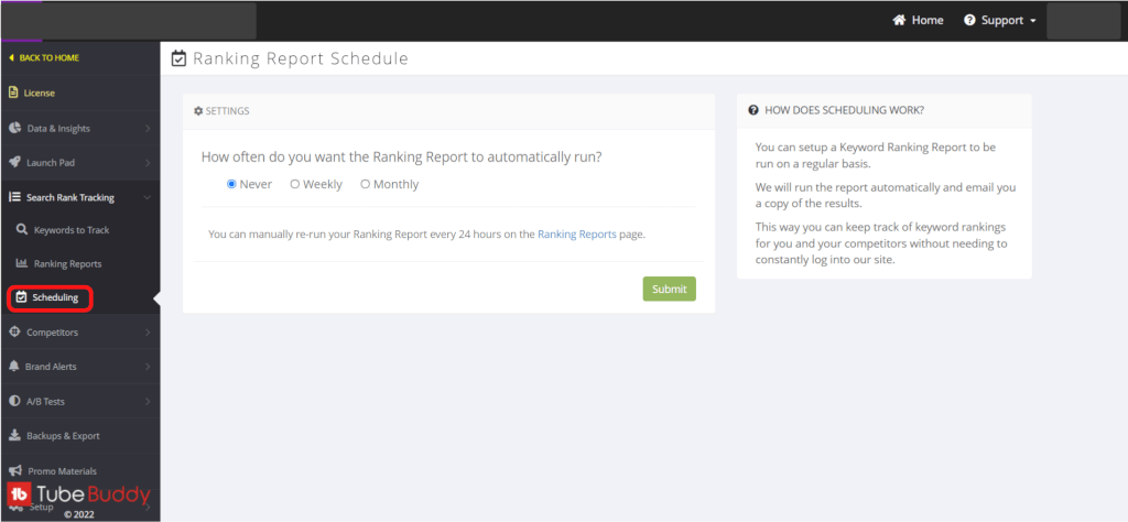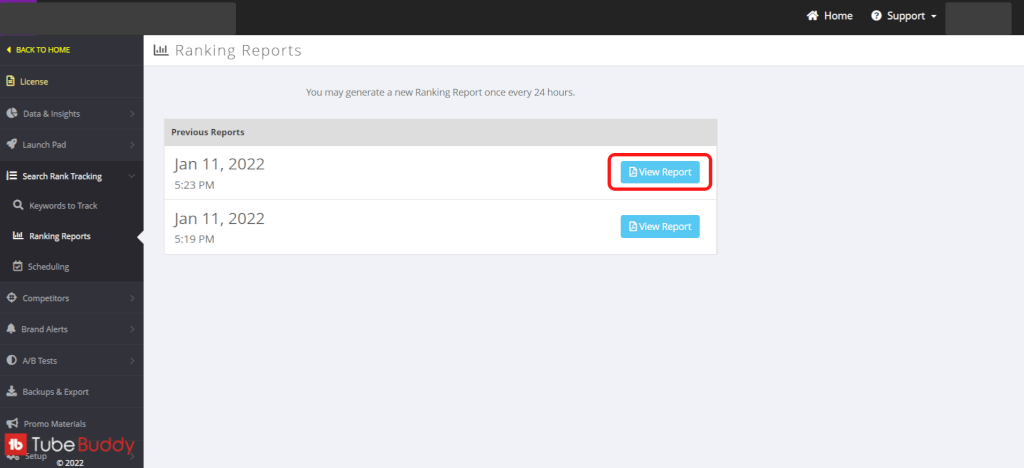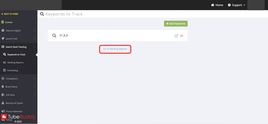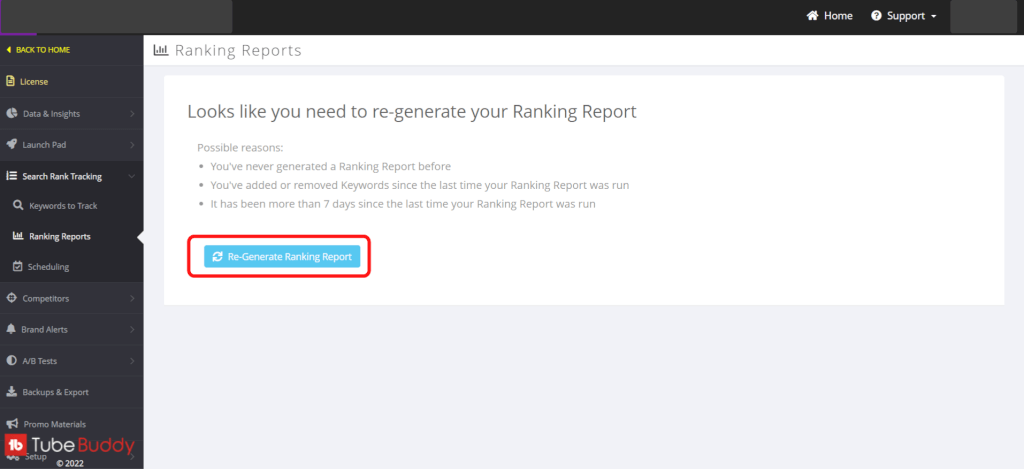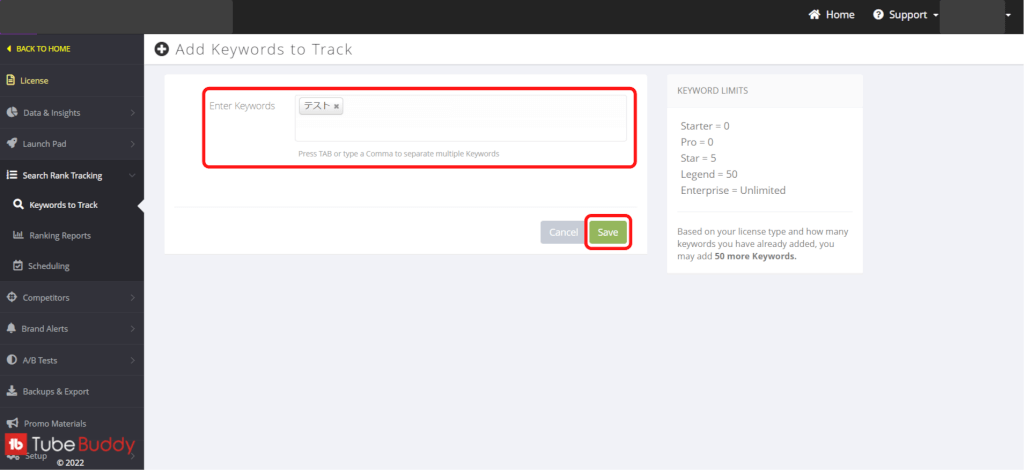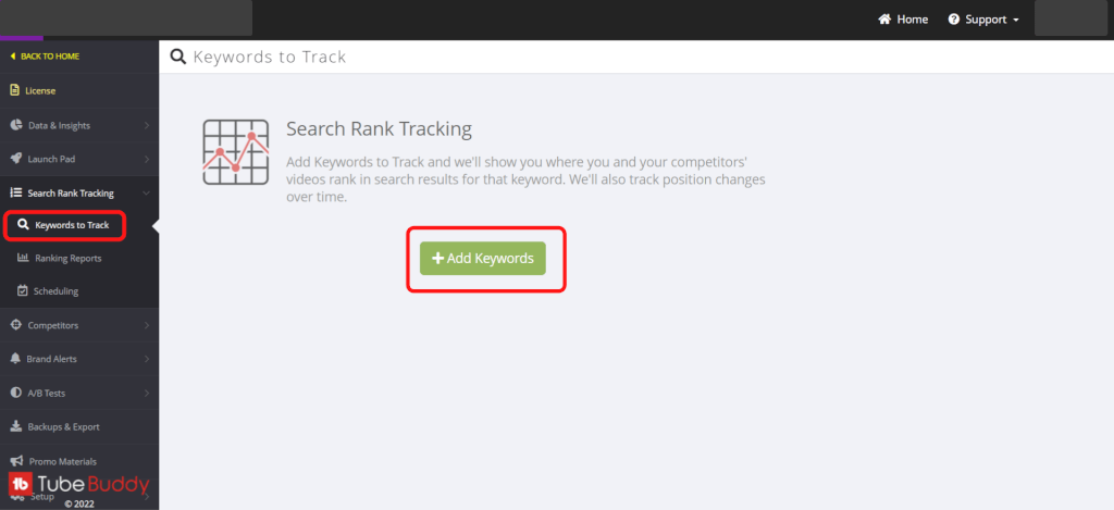 1 Rastrear até cinco palavras-chave. 2 Rastreamento de até 50 palavras-chave. 1. Vá para a tela do painel TubeBuddy e selecione ‘Search Rank Tracking’ na barra lateral esquerda. 2. Clique no botão ‘Palavras-chave para rastrear’ > ‘Adicionar palavras-chave’ 3. Digite as palavras-chave que você deseja rastrear em ‘Enter Keywords’ e clique em ‘Save’ 4. Clique em ‘Ir para relatórios de classificação’ 5. 5. Clique no botão ‘Re-gerar seu Relatório de Classificação’ 6. Clique no botão ‘Ver Relatório’. 6. Clique no botão ‘Ver relatório’ para verificar sua classificação de vídeos no YouTube e no Google. 7. Em “Programação”, você pode definir a freqüência com que deseja executar relatórios de classificação automaticamente. Considere de quais canais de busca os usuários pretendidos virão Acompanhe os vídeos dos concorrentes e procure por sementes de diferenciação nesse rastreamento. | ||||||||