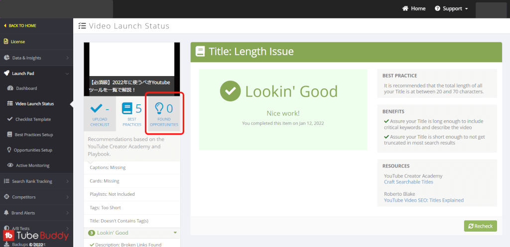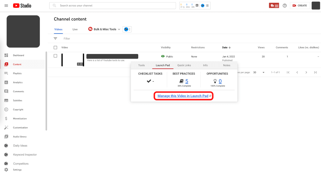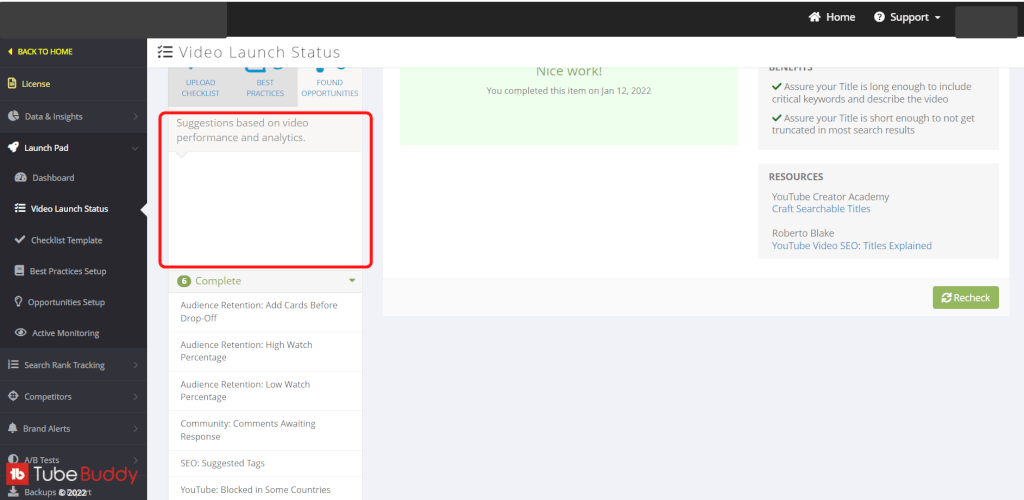 1. Selecione o botão ‘fb’ no conteúdo do Youtube e clique em ‘Adicionar vídeo ao Launch Pad’. ![]() 2. Selecione ‘Melhores Práticas’ para emitir uma lista de verificação para saber se seu vídeo está configurado corretamente. ![]() ∙ Crie itens de lista de verificação em linha com as operações de vídeo de seu próprio canal. | ||||||||