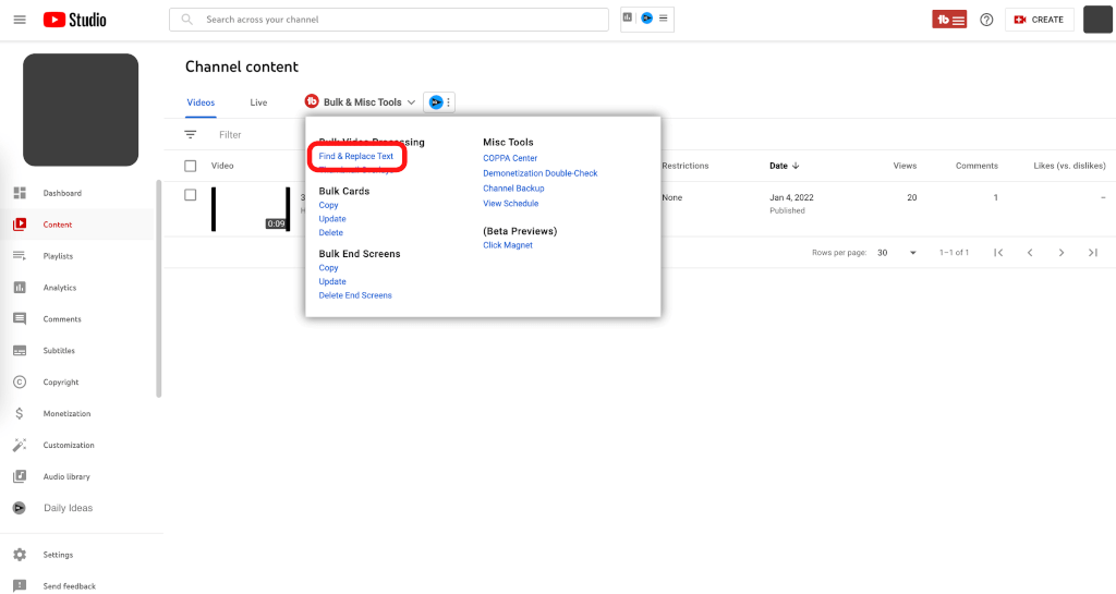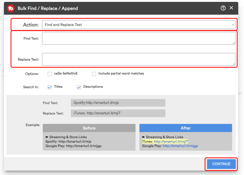 1. selecione ‘Localizar e Substituir Texto’ em Conteúdo do Youtube ![]() 2. Selecione a ação, descreva o conteúdo e clique em ‘Continuar’. ![]() 3. selecione o vídeo que você deseja aplicar e clique em ‘Continuar’ 4. selecione o vídeo específico que você deseja aplicar e clique em ‘Continuar’. ![]() 4. Selecione o vídeo específico que você deseja aplicar e clique em ‘Continuar’ 5. ![]() 5. Marque a caixa de seleção ‘Sim, faça isso’ e clique em ‘INICIAR!’ para operação em lote ![]() O texto pode ser pesquisado usando expressões regulares e correspondência de palavras inteiras. Clique no ícone de busca ao lado do vídeo para visualizar o vídeo após a sua publicação. A aplicação de substitutos de lote leva alguns segundos por vídeo, portanto, considere um máximo de 2.000 vídeos a serem aplicados. | ||||||||