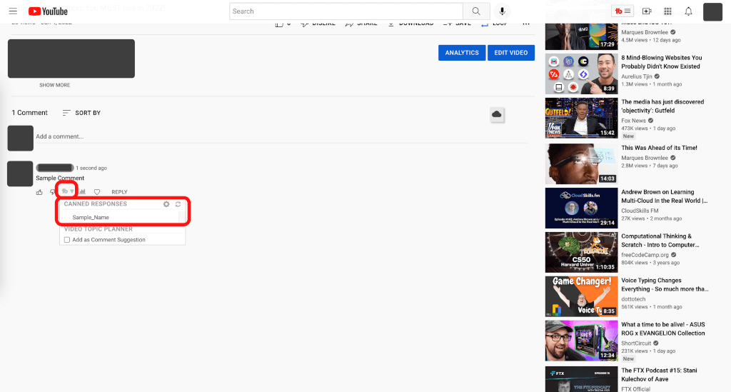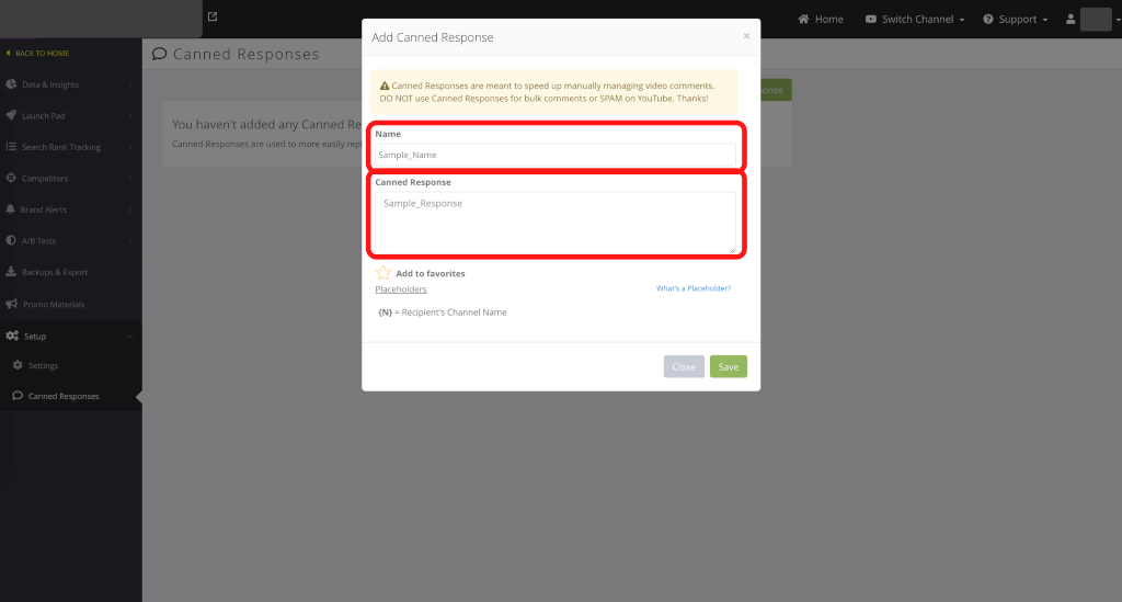 Somente um texto enlatado pode ser criado. 1. selecione ‘Respostas enlatadas’ no painel do Youtube ![]() 2. Clique no botão ‘Adicionar resposta enlatada’. ![]() 3. Insira um título e uma resposta enlatada e clique em ‘SAVE’ 4. ![]() 4. Agora você pode usar as respostas enlatadas nos comentários de seus vídeos ![]() Usando {N} em uma mensagem insere o nome do usuário do canal na mensagem e personaliza o texto de resposta. Atualmente disponível nas páginas da lista de assinantes e na ferramenta Community Connect. | ||||||||