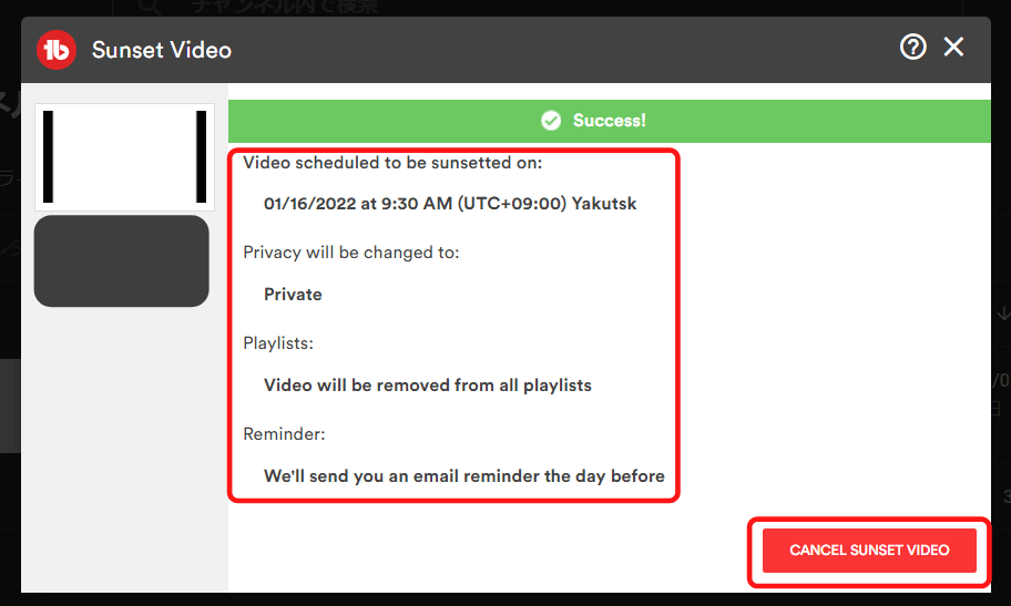 1. Selecione o botão ‘fb’ no conteúdo do Youtube e clique em ‘Sunset Videos’. ![]() 2. Defina a data, hora, ocultar, lista de reprodução e conteúdo do lembrete e clique em ‘SCHEDULE SUNSET’ 3. ![]() 3. Verifique o conteúdo e você está pronto (clique em ‘CANCEL SUNSET VIDEO’ se você quiser modificá-lo) ![]() Receber uma notificação (via e-mail) 24 horas antes de realmente se tornar privado. | ||||||||
