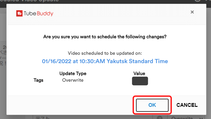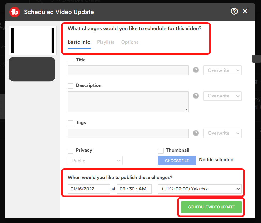 1. Selecione o botão ‘fb’ no conteúdo do Youtube e clique em ‘Scheduled Video Update’. 2. ![]() 2. Alterar o conteúdo das ‘Informações básicas’, ‘Listas de reprodução’ e ‘Opções’, definir a data e a hora da alteração e clicar em ‘ATUALIZAÇÃO DO VÍDEO DO CALENDÁRIO’. ![]() 3. Após confirmar as mudanças, clique em ‘OK’ para agendar a atualização do vídeo. ![]() A função rollback pode ser usada para reverter à meta-informação que existia antes das mudanças serem feitas (útil para promoções temporárias). | ||||||||