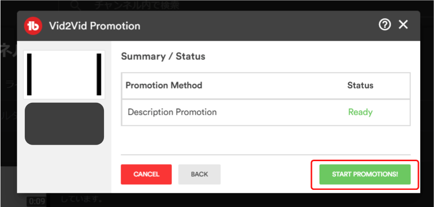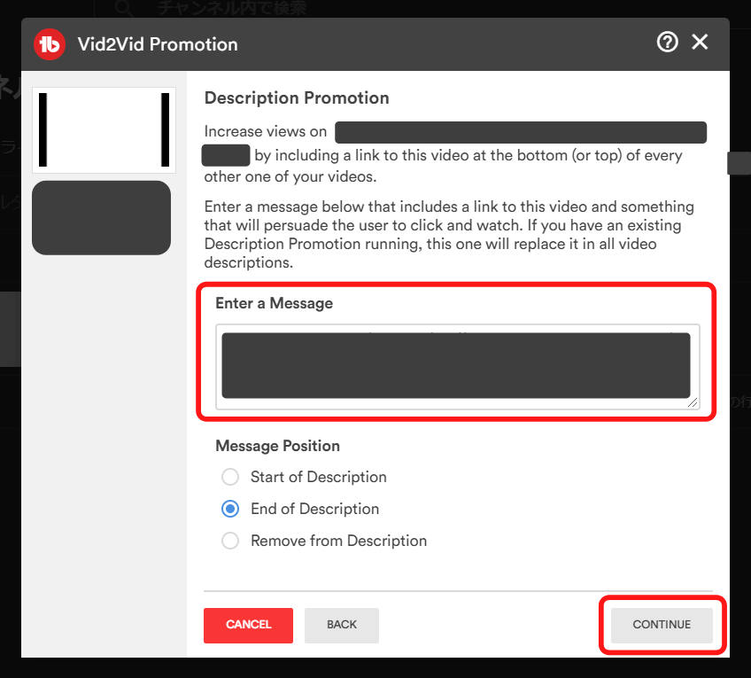 1. selecione o botão ‘fb’ no conteúdo do Youtube e clique em ‘Promoção Vid2Vid2’. ![]() 2. Clique no botão ‘CONTINUAR’. ![]() 3. Digite uma mensagem em ‘Digite uma mensagem’, selecione ‘Posição da mensagem’ e clique no botão ‘CONTINUAR’. ![]() 4. Clique no botão ‘START PROMOTIONS! ![]() A execução da ferramenta substitui qualquer execução anterior. A personalização da redação da publicidade é possível. |