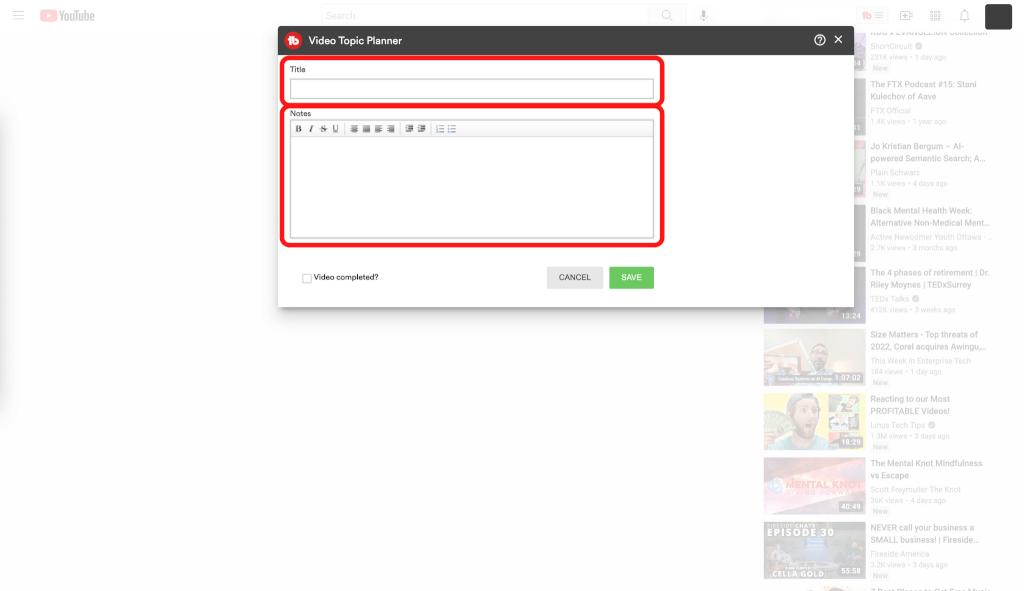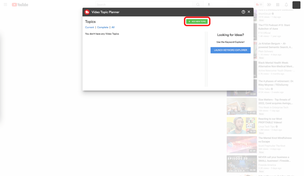 * Até 5 tópicos de vídeo. 1. selecione ‘Video Topic Planner’ no menu TubeBuddy ![]() 2. Anote um novo tópico de “Adicionar novo tópico”. ![]() 3. No memorando, digite um título e o conteúdo do memorando. ![]() Arraste e solte para trocar tópicos. O planejador de tópicos do vídeo pode ser usado para colocar tópicos no planejador de tópicos do vídeo a partir do lado direito da seção de comentários do vídeo. |