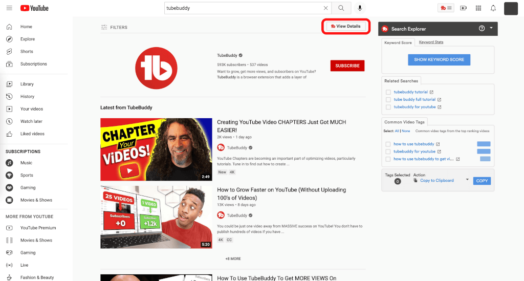 1. Clique em ‘Ver detalhes’ no canto superior direito dos resultados da busca no Youtube. ![]() 1. Verifique as tags, os assinantes do canal e o número de likes ao lado do vídeo. ![]() Clique no símbolo da lupa para uma análise mais detalhada em KeywordExplorer. As etiquetas de vídeo podem ser copiadas. | ||||||||