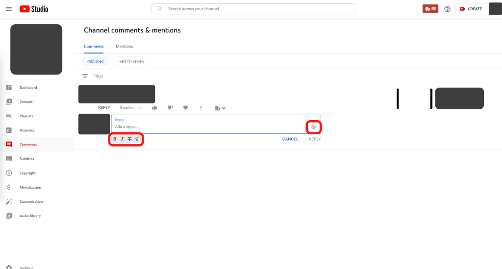 1. selecione ‘Comentários’ no painel do Youtube ![]() 2. Aplicar facilmente formatação em negrito, itálico, strikethrough e emoji aos comentários ![]() | ||||||||
