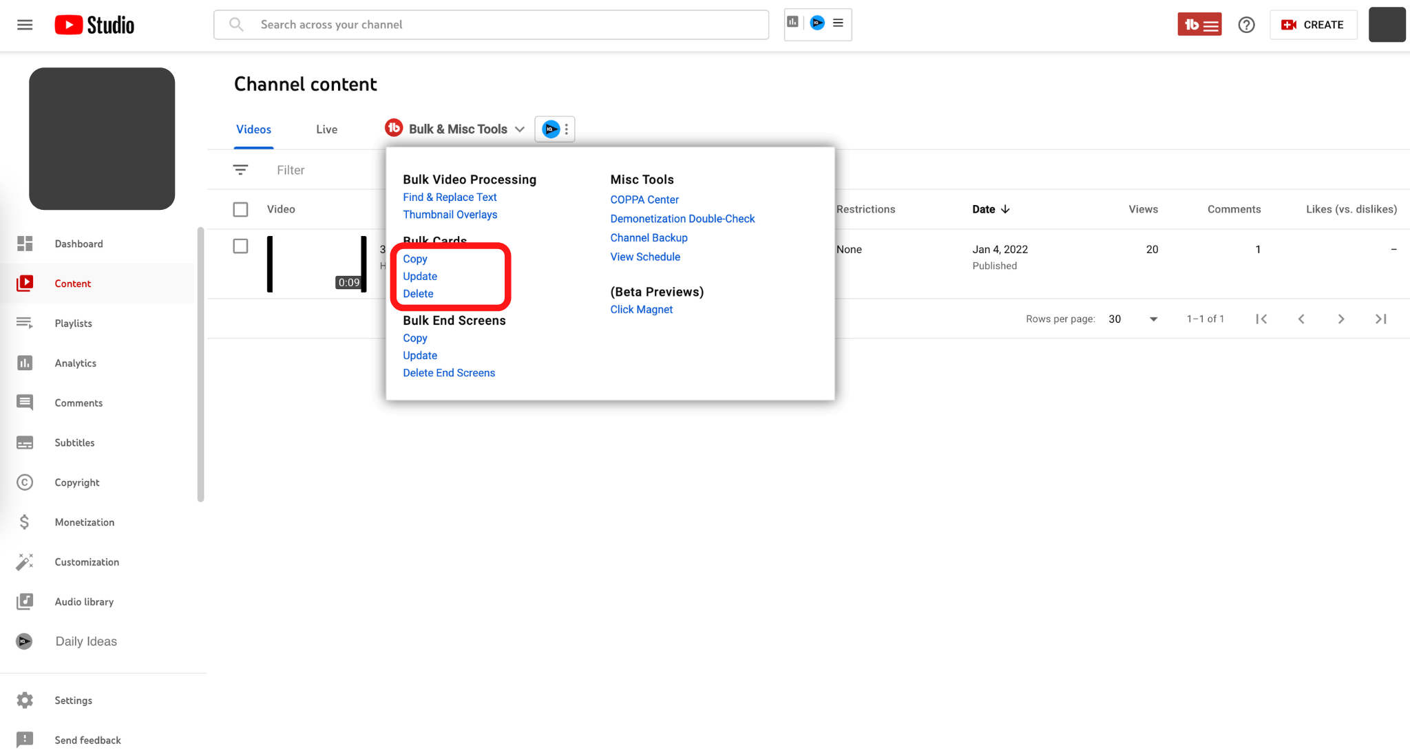 1. selecione ‘Copiar’, ‘Atualizar’ ou ‘Excluir’ no conteúdo de vídeo de seu canal. 2. ![]() 2. ‘Copiar’ permite copiar cartões em lotes, reduzindo sua carga de trabalho. ] 3. ‘Atualizar’ permite atualizar cartões em lotes, levando a uma carga de trabalho reduzida. ![]() 4. ‘Excluir’ permite excluir cartões em lotes, reduzindo sua carga de trabalho. ![]() | ||||||||