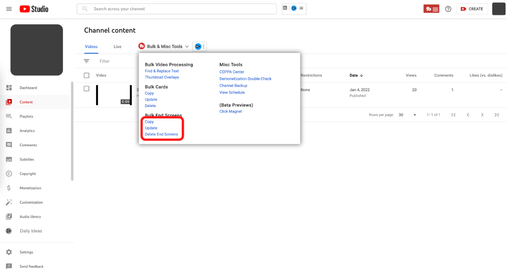 | Bulk Update End Screens (Telas finais de atualização a granel) | Cópia em massa, atualização e exclusão de telas finais de vídeo.
