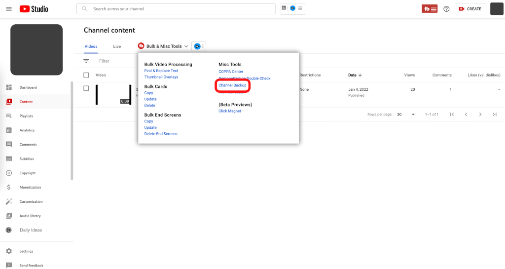 | Channel Backup (Backup do Canal) | Faz o backup de todos os metadados dos vídeos de um canal.