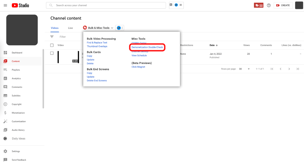 | Demonetization Double-Check (Desmonetização Double-Check) | Verifica se há omissões de vídeos não lucrativos.