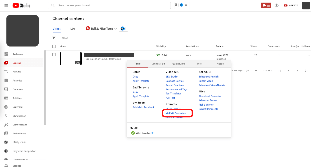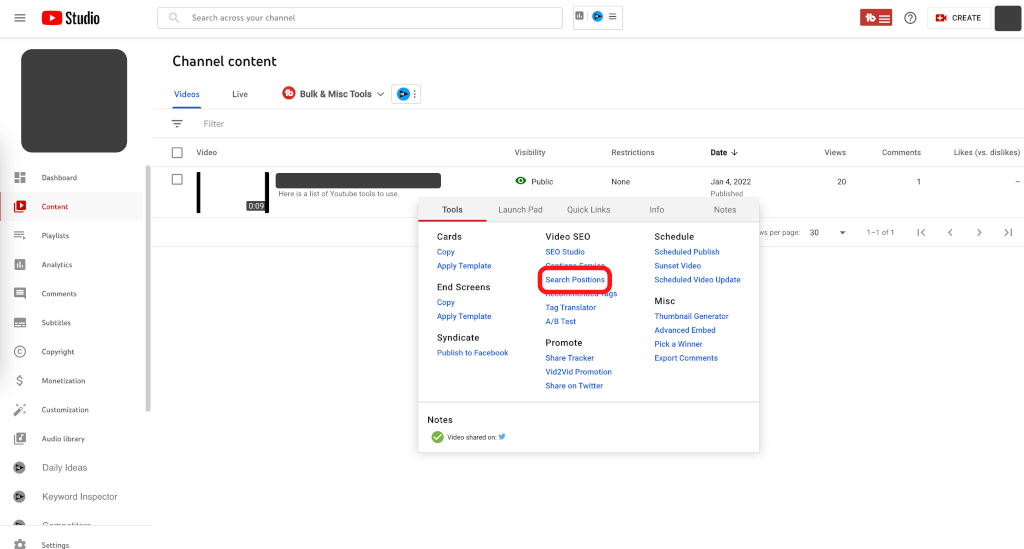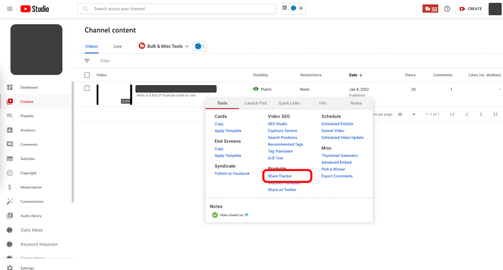 1. selecione “Share Tracker” no conteúdo do Youtube 2. Clique nos ícones das redes sociais para ir direto para a tela de compartilhamento, onde você pode digitar seu texto 3. Selecione as caixas de seleção cinza para registrar se você tem ou não compartilhado. Não há necessidade de vincular a TubeBuddy a cada conta de rede social. | ||||||||