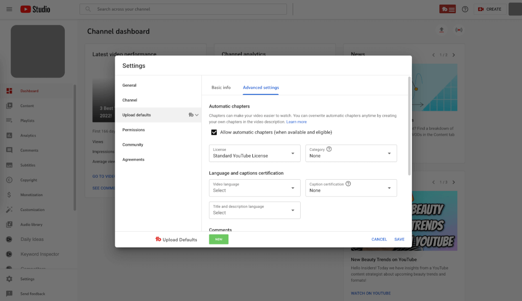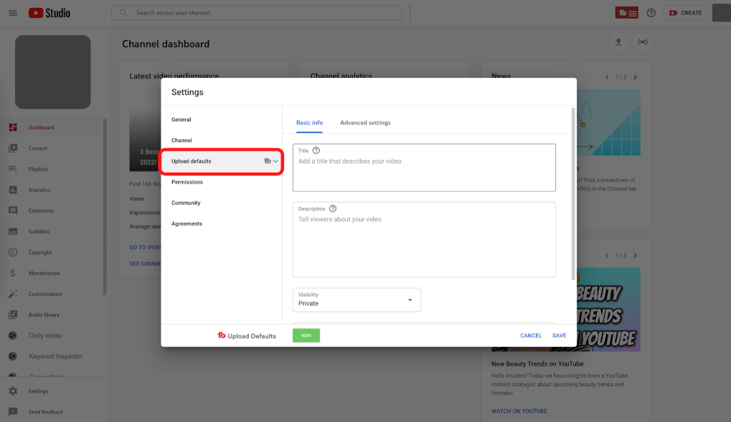 Há um perfil padrão que pode ser criado. 1. selecione ‘Configurações’ no painel do Youtube ![]() 2. selecione ‘Configurações padrão para vídeos carregados’. ![]() 3. Digite o conteúdo de ‘Informações básicas’ e ‘Configurações avançadas’ e clique no botão ‘Novo’. ![]() 4. Clique no botão ‘SAVE’ para criar um modelo de configuração padrão para as mensagens do YouTube. Novos vídeos adaptam o modelo na página de upload. As configurações de perfil podem ser aplicadas tanto aos vídeos antigos quanto aos novos. | ||||||||