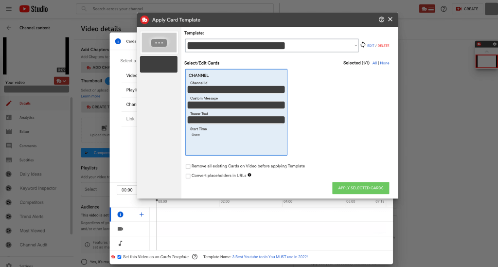 | Para usuários intermediários Importância: ★★★★ | Card Templates(Modelos de cartões) End Screen Templates(Modelos de tela final) Bulk Thumbnail Overlays(Sobreposições de miniaturas a granel) Auto Translator(tradução automática de meta-informação) |