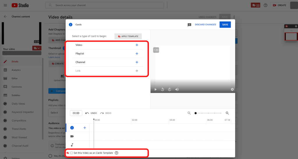 1. selecione o botão ‘Mais’ no conteúdo do Youtube 2. ![]() 2. Role para baixo até ver a saída do ‘cartão’ e clique no botão Modificar. ![]() 3. selecione o cartão que você deseja definir para o vídeo a partir do vídeo, lista de reprodução, canal ou link ![]() 4. Defina a mensagem que aparecerá no vídeo e onde ela será inserida no vídeo, depois clique em Salvar e o cartão aparecerá no vídeo ![]() O modelo pode ser criado em vários formatos, então prepare-os de acordo com o tipo de vídeo que você deseja carregar. A função “Smart Timing” pode ser usada para definir o cartão a ser inserido na posição apropriada, independentemente do comprimento do novo vídeo. | ||||||||