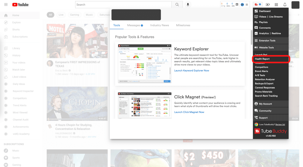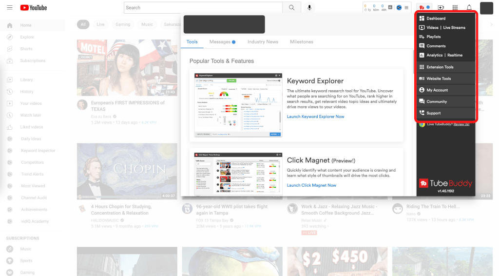 Ao clicar no botão ‘fb’, a tela abaixo aparecerá e você poderá acessar várias funções do TubeBuddy.