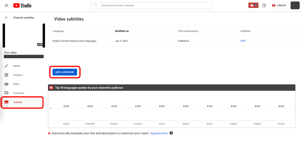 | Auto Translator (Tradução automática de meta-informação). | Traduza e registre o título e a descrição do vídeo.