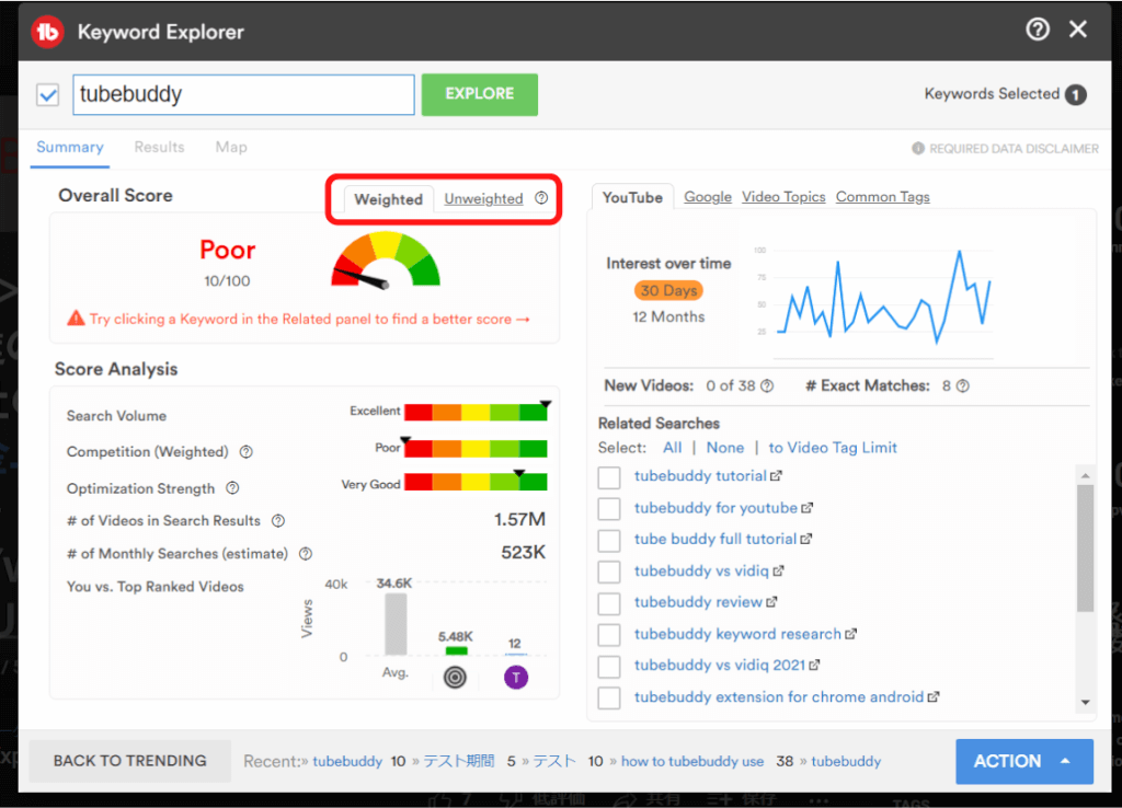 「Weighted」は、TubeBuddy(チューブバディ)が自分のチャンネルの動画のパフォーマンスを考慮した結果です。