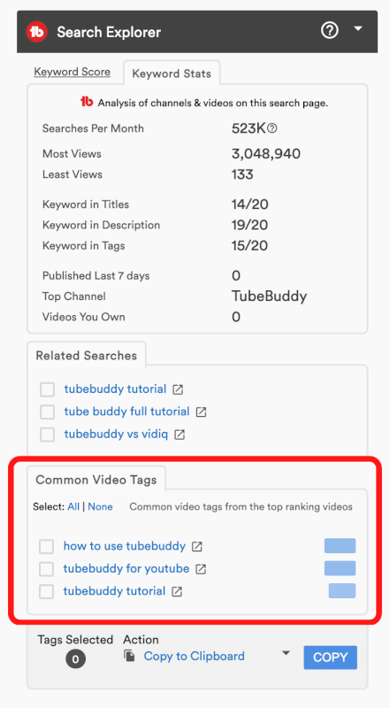 上記の画像のとおり、「Common Video Tags」では、検索結果の上位動画で使用されているタグが表示されます。