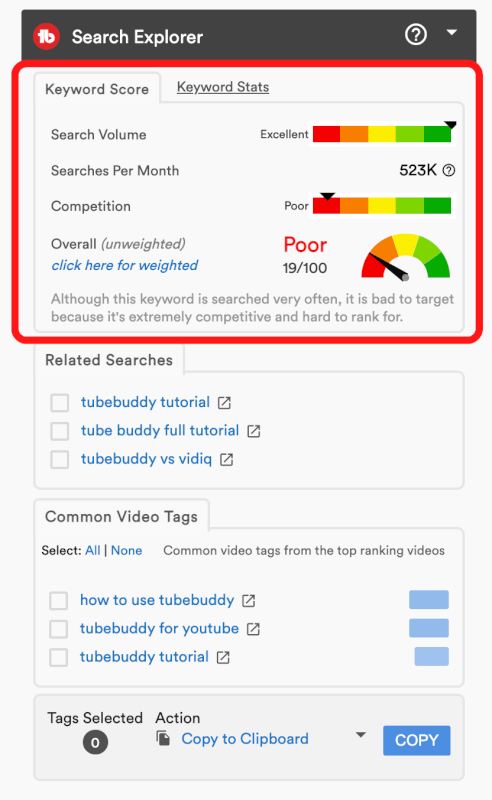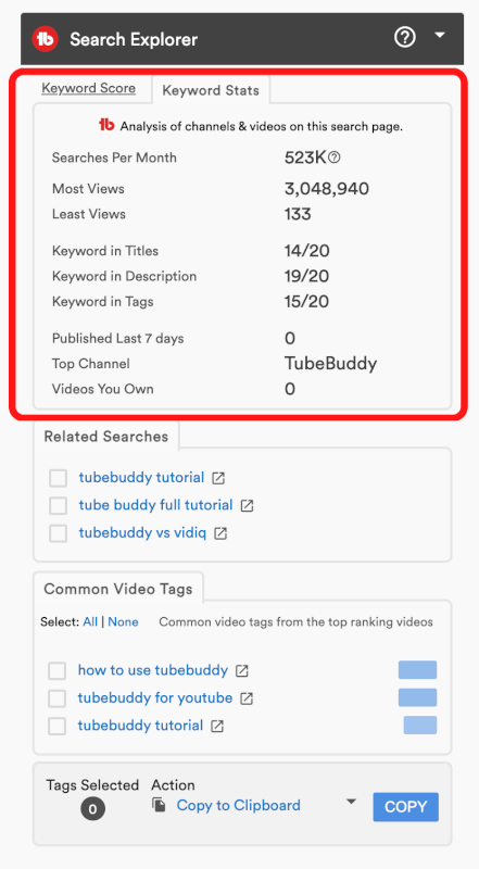 • 「Search Explorer」の中には「Keyword Score」「Keyword Stats」「Related Searches」「Common Video Tags」のツールがある