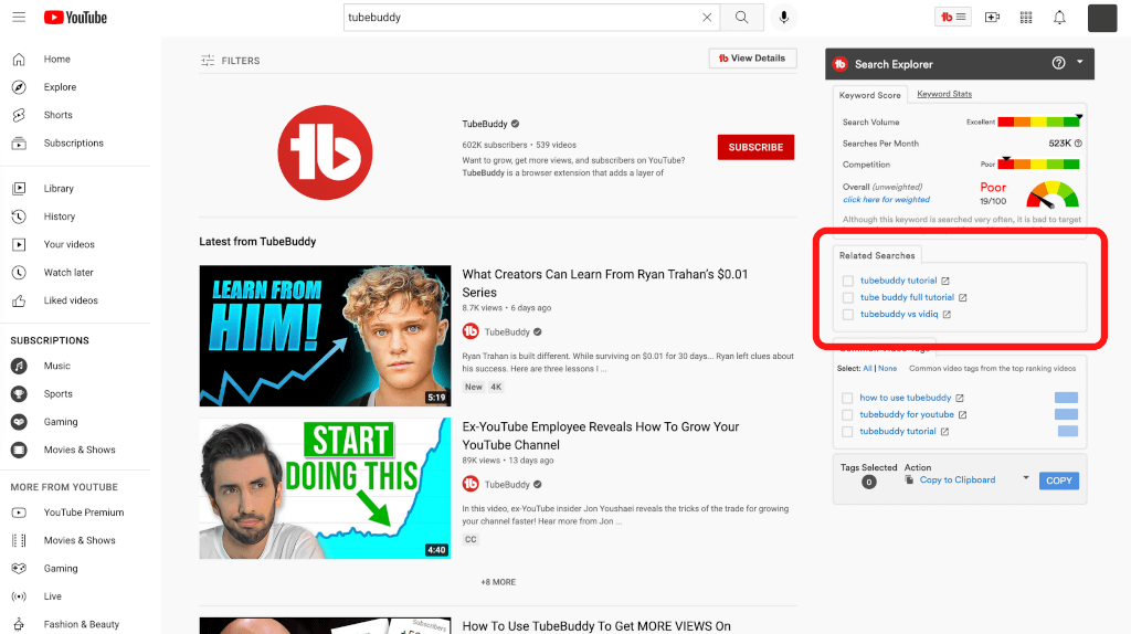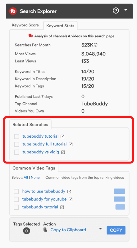 上記の画像のとおり、「Related Searches」では、検索したキーワードから、TubeBuddy(チューブバディ)によって、自動で検出される検索候補が表示されます。